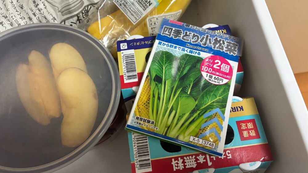 「1袋60円」「2袋セット100円(別の種と組み合わせてもOK)」という表示を目の当たりにしたわたしは、記憶を失ってしまったかのように小松菜と併せて2袋を抱えてレジに並んでいました。