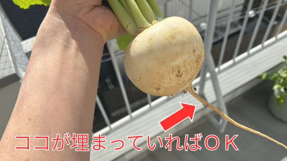 ちなみにカブは、根(実)がすべて土に埋まっている必要はありません。