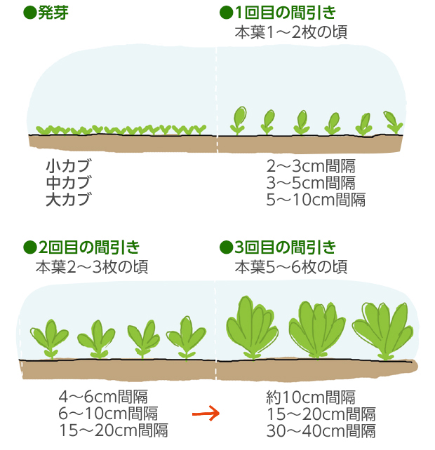 播種は筋蒔きを行うのが一般的なため、生育初期に「間引き」が必要になります。(タイミングは上図をご参照ください。)